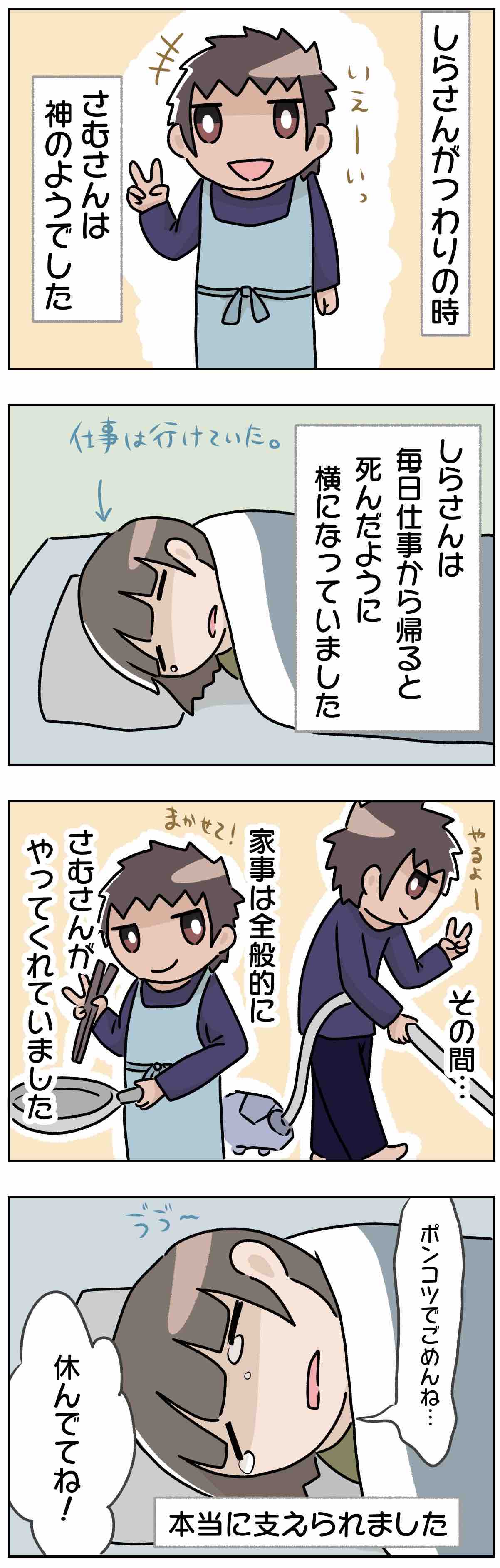 しらさんとさむさんで苦手な家事を補う感じで生活していたのですが